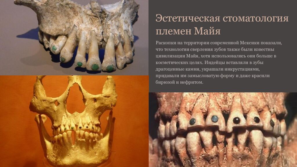 Эстетическая стоматология племен Майя Раскопки на территории современной Мексики показали, что технологии сверления зубов также были известны цивилизации Майя, хотя использовались они больше в косметических целях. Индейцы вставляли в зубы драгоценные камни, украшали инкрустациями, придавали им замысловатую форму и даже красили бирюзой и нефритом.