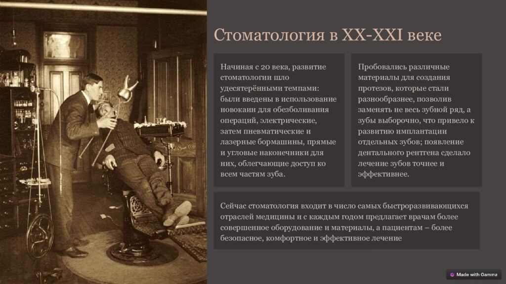 Стоматология в ХХ- XXI веке Начиная с 20 века, развитие стоматологии шло удесятерёнными темпами: были введены в использование новокаин для обезболивания операций, электрические, затем пневматические и лазерные бормашины, прямые и угловые наконечники для них, облегчающие доступ ко всем частям зуба. П робовались различные материалы для создания протезов, которые стали разнообразнее, позволив заменять не весь зубной ряд, а зубы выборочно, что привело к развитию имплантации отдельных зубов; появление дентального рентгена сделало лечение зубов точнее и эффективнее. Сейчас стоматология входит в число самых быстроразвивающихся отраслей медицины и с каждым годом предлагает врачам более совершенное оборудование и материалы, а пациентам – более безопасное, комфортное и эффективное лечение