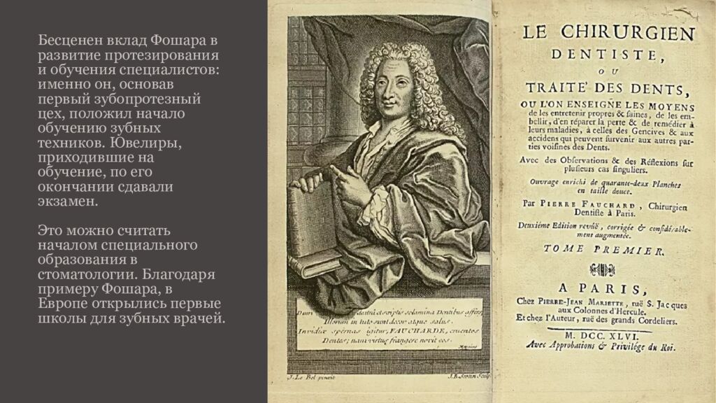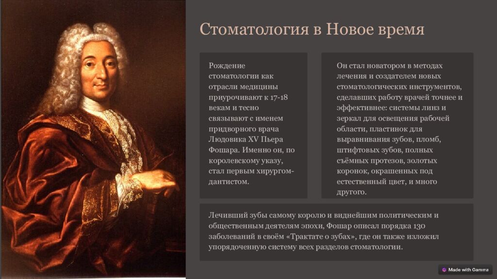 Стоматология в Новое время Рождение стоматологии как отрасли медицины приурочивают к 17-18 векам и тесно связывают с именем придворного врача Людовика XV Пьера Фошара. Именно он, по королевскому указу, стал первым хирургом-дантистом. Он стал новатором в методах лечения и создателем новых стоматологических инструментов, сделавших работу врачей точнее и эффективнее: системы линз и зеркал для освещения рабочей области, пластинок для выравнивания зубов, пломб, штифтовых зубов, полных съёмных протезов, золотых коронок, окрашенных под естественный цвет, и много другого. Лечивший зубы самому королю и виднейшим политическим и общественным деятелям эпохи, Фошар описал порядка 130 заболеваний в своём «Трактате о зубах», где он также изложил упорядоченную систему всех разделов стоматологии.