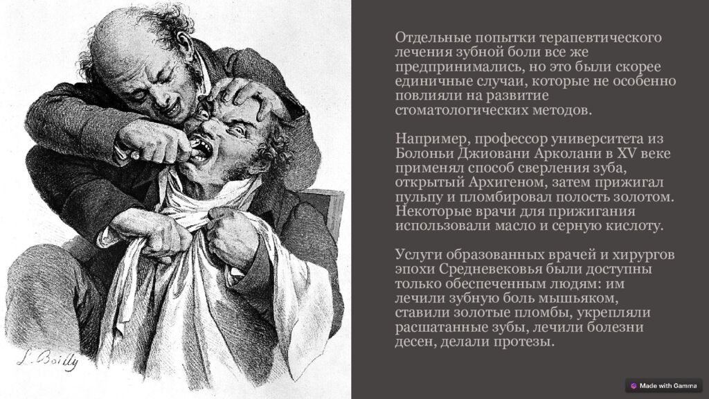 Отдельные попытки терапевтического лечения зубной боли все же предпринимались, но это были скорее единичные случаи, которые не особенно повлияли на развитие стоматологических методов. Например, профессор университета из Болоньи Джиовани Арколани в XV веке применял способ сверления зуба, открытый Архигеном, затем прижигал пульпу и пломбировал полость золотом. Некоторые врачи для прижигания использовали масло и серную кислоту. Услуги образованных врачей и хирургов эпохи Средневековья были доступны только обеспеченным людям: им лечили зубную боль мышьяком, ставили золотые пломбы, укрепляли расшатанные зубы, лечили болезни десен, делали протезы.