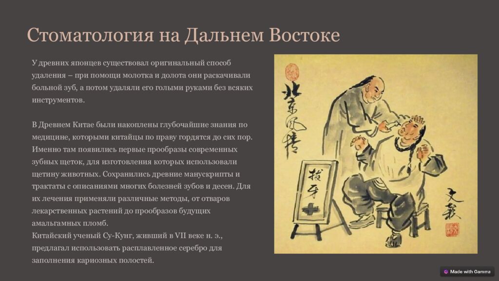 Стоматология на Дальнем Востоке У древних японцев существовал оригинальный способ удаления – при помощи молотка и долота они раскачивали больной зуб, а потом удаляли его голыми руками без всяких инструментов. В Древнем Китае были накоплены глубочайшие знания по медицине, которыми китайцы по праву гордятся до сих пор. Именно там появились первые прообразы современных зубных щеток, для изготовления которых использовали щетину животных. Сохранились древние манускрипты и трактаты с описаниями многих болезней зубов и десен. Для их лечения применяли различные методы, от отваров лекарственных растений до прообразов будущих амальгамных пломб. Китайский ученый Су- Кунг, живший в VII веке н. э., предлагал использовать расплавленное серебро для заполнения кариозных полостей.