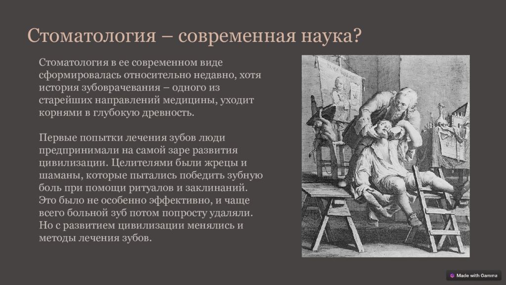Стоматология – современная наука? Стоматология в ее современном виде сформировалась относительно недавно, хотя история зубоврачевания – одного из старейших направлений медицины, уходит корнями в глубокую древность. Первые попытки лечения зубов люди предпринимали на самой заре развития цивилизации. Целителями были жрецы и шаманы, которые пытались победить зубную боль при помощи ритуалов и заклинаний. Это было не особенно эффективно, и чаще всего больной зуб потом попросту удаляли. Но с развитием цивилизации менялись и методы лечения зубов.