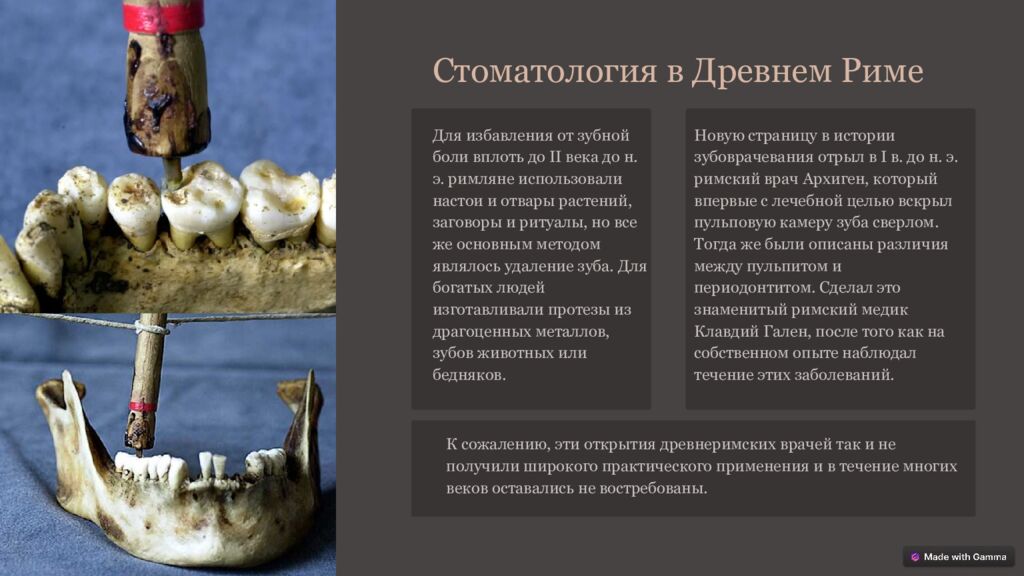 Стоматология в Древнем Риме Для избавления от зубной боли вплоть до II века до н. э. римляне использовали настои и отвары растений, заговоры и ритуалы, но все же основным методом являлось удаление зуба. Для богатых людей изготавливали протезы из драгоценных металлов, зубов животных или бедняков. Новую страницу в истории зубоврачевания отрыл в I в. до н. э. римский врач Архиген, который впервые с лечебной целью вскрыл пульповую камеру зуба сверлом. Тогда же были описаны различия между пульпитом и периодонтитом. Сделал это знаменитый римский медик Клавдий Гален, после того как на собственном опыте наблюдал течение этих заболеваний. К сожалению, эти открытия древнеримских врачей так и не получили широкого практического применения и в течение многих веков оставались не востребованы.