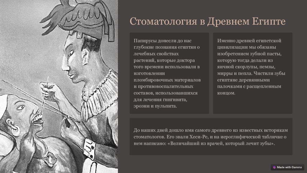 Стоматология в Древнем Египте Папирусы донесли до нас глубокие познания египтян о лечебных свойствах растений, которые доктора того времени использовали в изготовлении пломбировочных материалов и противовоспалительных составов, использовавшихся для лечения гингивита, эрозии и пульпита. Именно древней египетской цивилизации мы обязаны изобретением зубной пасты, которую тогда делали из яичной скорлупы, пемзы, мирры и пепла. Чистили зубы египтяне деревянными палочками с расщепленным концом. До наших дней дошло имя самого древнего из известных историкам стоматологов. Его звали Хеси -Ре, и на иероглифической табличке о нем написано: «Величайший из врачей, который лечит зубы».