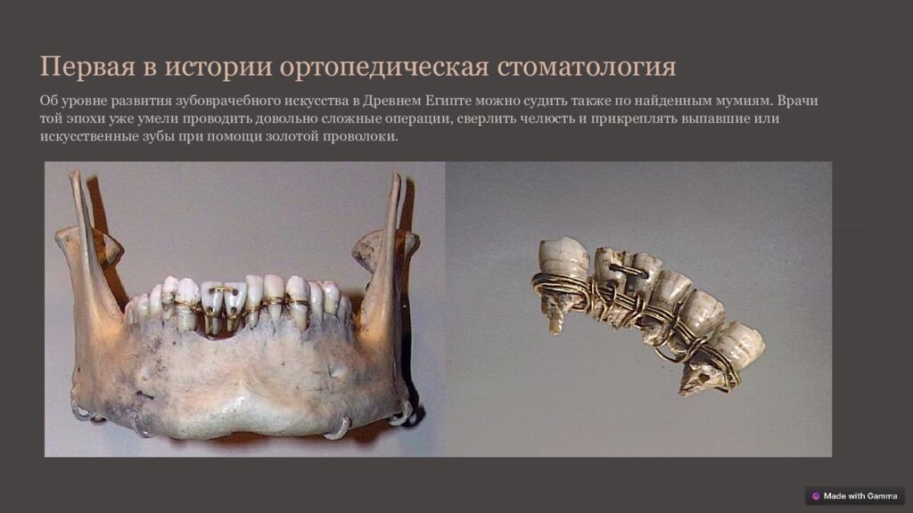 Первая в истории ортопедическая стоматология Об уровне развития зубоврачебного искусства в Древнем Египте можно судить также по найденным мумиям. Врачи той эпохи уже умели проводить довольно сложные операции, сверлить челюсть и прикреплять выпавшие или искусственные зубы при помощи золотой проволоки.