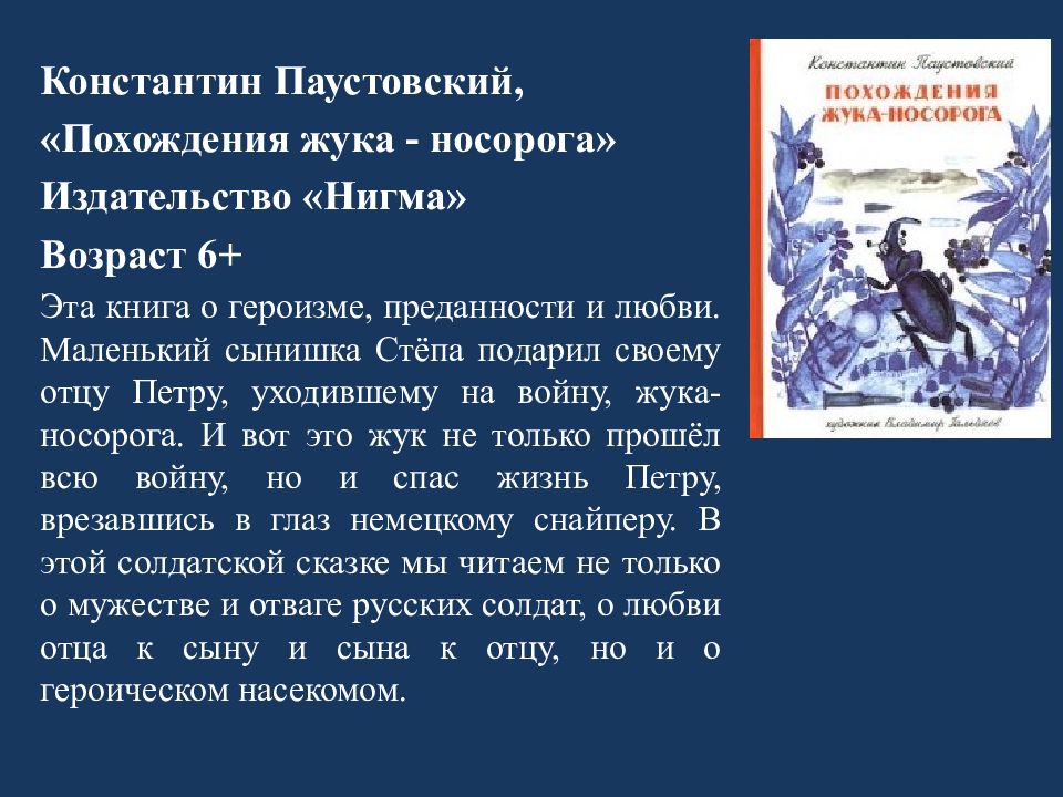Константин Паустовский, «Похождения жука - носорога» Издательство «Нигма» Возраст 6+ Эта книга о героизме, преданности и любви. Маленький сынишка Стёпа подарил своему отцу Петру, уходившему на войну, жука-носорога. И вот это жук не только прошёл всю войну, но и спас жизнь Петру, врезавшись в глаз немецкому снайперу. В этой солдатской сказке мы читаем не только о мужестве и отваге русских солдат, о любви отца к сыну и сына к отцу, но и о героическом насекомом.