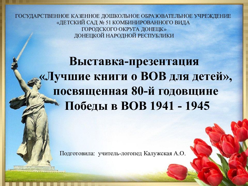 ГОСУДАРСТВЕННОЕ КАЗЕННОЕ ДОШКОЛЬНОЕ ОБРАЗОВАТЕЛЬНОЕ УЧРЕЖДЕНИЕ « ДЕТСКИЙ САД № 51 КОМБИНИРОВАННОГО ВИДА ГОРОДСКОГО ОКРУГА ДОНЕЦК» ДОНЕЦКОЙ НАРОДНОЙ РЕСПУБЛИКИ Выставка-презентация «Лучшие книги о ВОВ для детей », п освященная 80-й годовщине Победы в ВОВ 1941 - 1945 Подготовила: учитель-логопед Калужская А.О.