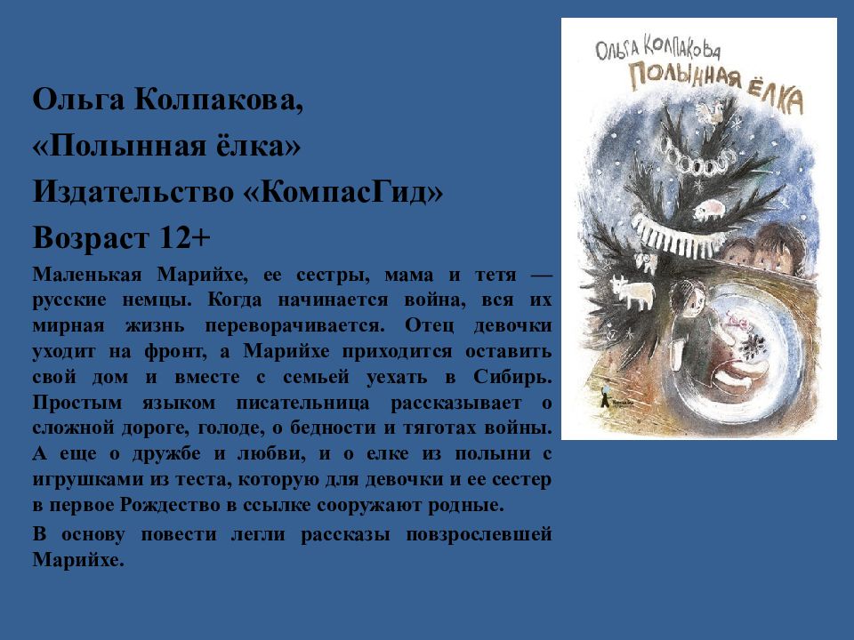 Ольга Колпакова, «Полынная ёлка» Издательство «КомпасГид» Возраст 12+ Маленькая Марийхе, ее сестры, мама и тетя — русские немцы. Когда начинается война, вся их мирная жизнь переворачивается. Отец девочки уходит на фронт, а Марийхе приходится оставить свой дом и вместе с семьей уехать в Сибирь. Простым языком писательница рассказывает о сложной дороге, голоде, о бедности и тяготах войны. А еще о дружбе и любви, и о елке из полыни с игрушками из теста, которую для девочки и ее сестер в первое Рождество в ссылке сооружают родные. В основу повести легли рассказы повзрослевшей Марийхе.