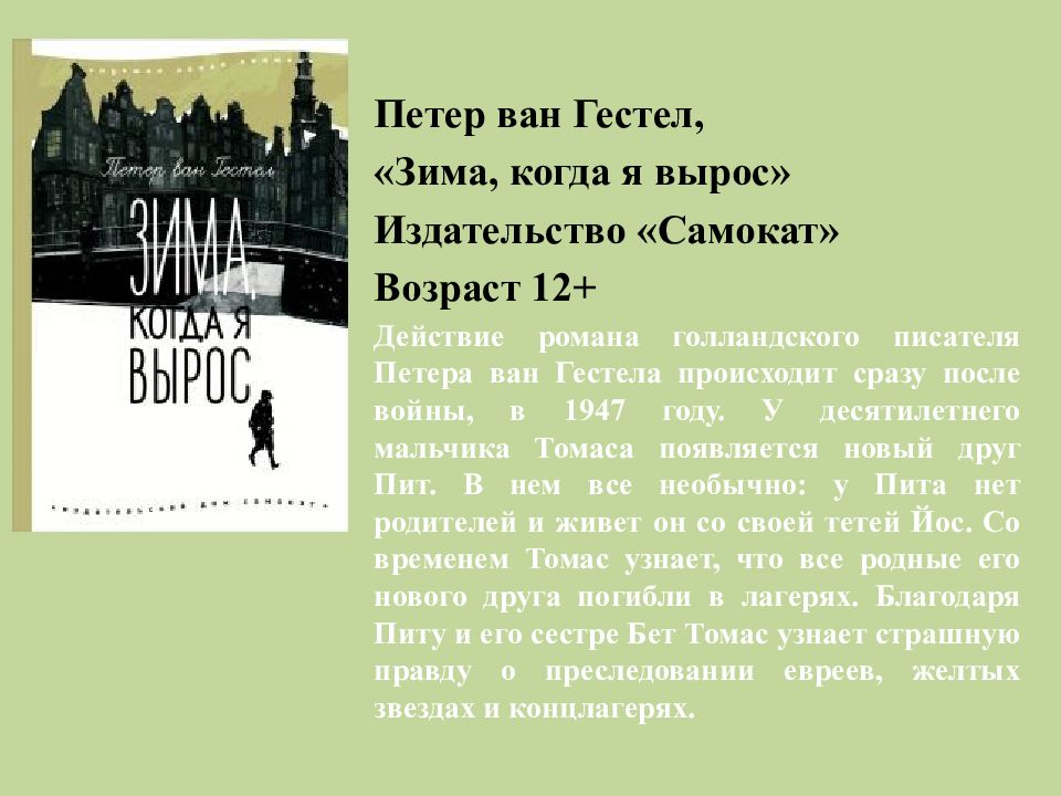 Петер ван Гестел, «Зима, когда я вырос» Издательство «Самокат» Возраст 12+ Действие романа голландского писателя Петера ван Гестела происходит сразу после войны, в 1947 году. У десятилетнего мальчика Томаса появляется новый друг Пит. В нем все необычно: у Пита нет родителей и живет он со своей тетей Йос. Со временем Томас узнает, что все родные его нового друга погибли в лагерях. Благодаря Питу и его сестре Бет Томас узнает страшную правду о преследовании евреев, желтых звездах и концлагерях.