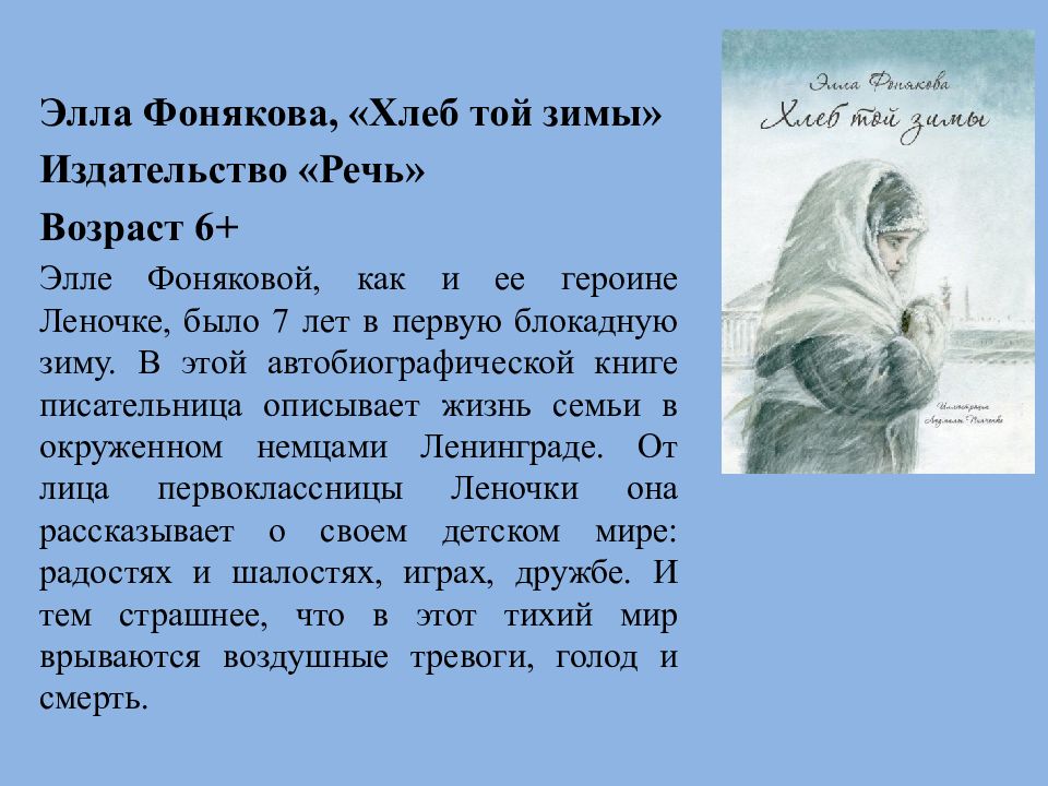 Элла Фонякова, «Хлеб той зимы» Издательство « Речь» Возраст 6+ Элле Фоняковой, как и ее героине Леночке, было 7 лет в первую блокадную зиму. В этой автобиографической книге писательница описывает жизнь семьи в окруженном немцами Ленинграде. От лица первоклассницы Леночки она рассказывает о своем детском мире: радостях и шалостях, играх, дружбе. И тем страшнее, что в этот тихий мир врываются воздушные тревоги, голод и смерть.