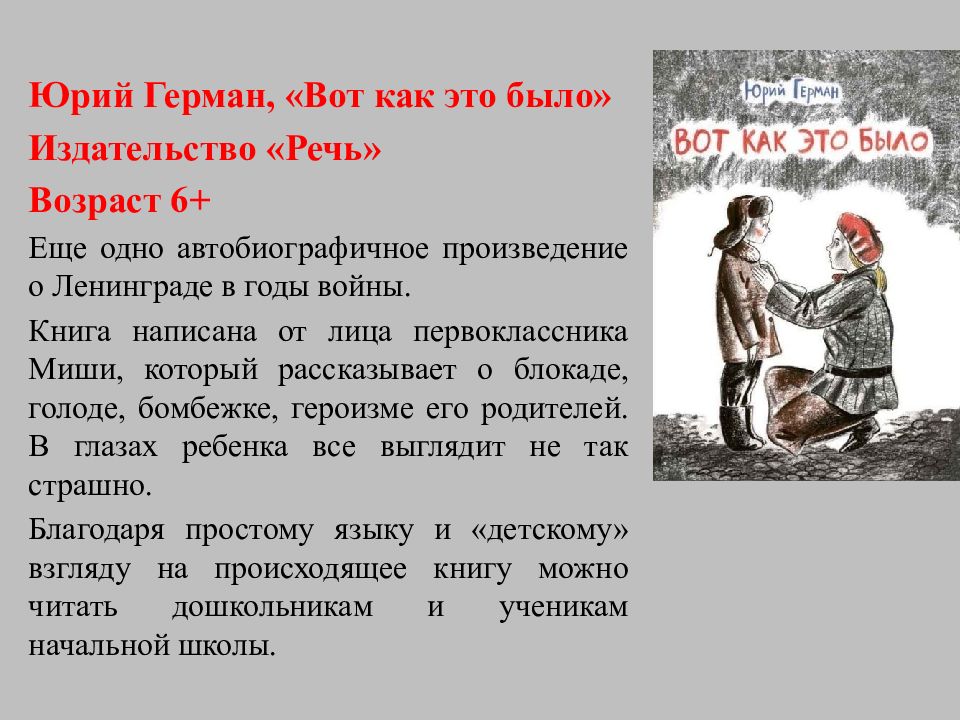 Юрий Герман, «Вот как это было» Издательство «Речь» Возраст 6+ Еще одно автобиографичное произведение о Ленинграде в годы войны. Книга написана от лица первоклассника Миши, который рассказывает о блокаде, голоде, бомбежке, героизме его родителей. В глазах ребенка все выглядит не так страшно. Благодаря простому языку и «детскому» взгляду на происходящее книгу можно читать дошкольникам и ученикам начальной школы.