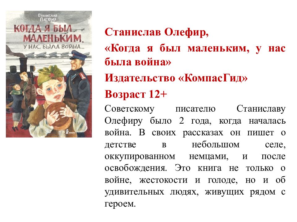 Станислав Олефир, «Когда я был маленьким, у нас была война» Издательство «КомпасГид» Возраст 12+ Советскому писателю Станиславу Олефиру было 2 года, когда началась война. В своих рассказах он пишет о детстве в небольшом селе, оккупированном немцами, и после освобождения. Это книга не только о войне, жестокости и голоде, но и об удивительных людях, живущих рядом с героем.