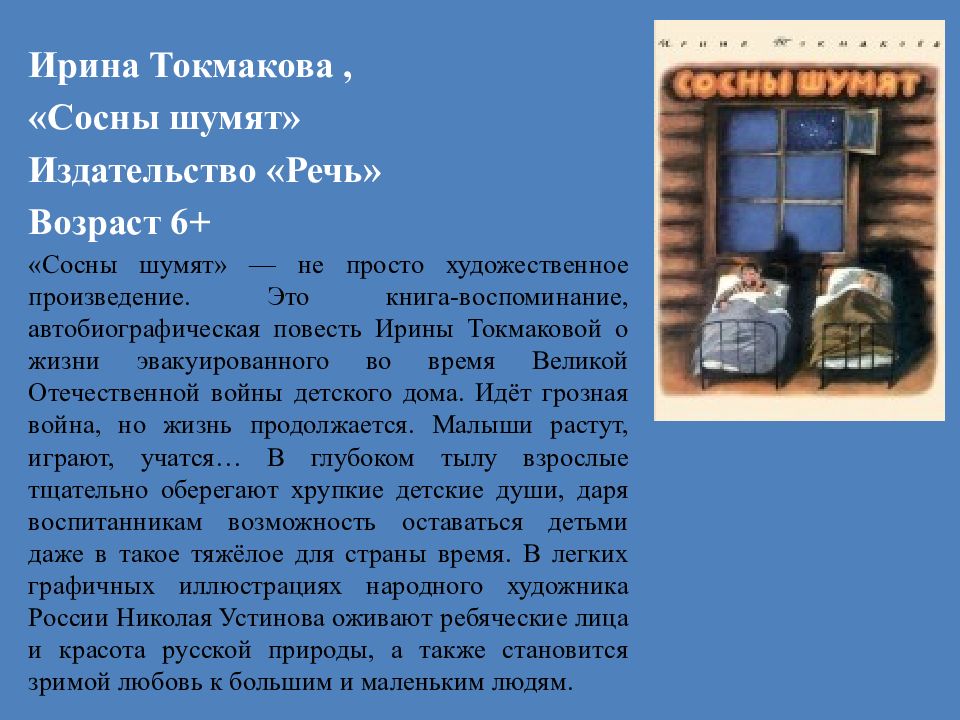 Ирина Токмакова, «Сосны шумят» Издательство «Речь» Возраст 6+ «Сосны шумят» — не просто художественное произведение. Это книга-воспоминание, автобиографическая повесть Ирины Токмаковой о жизни эвакуированного во время Великой Отечественной войны детского дома. Идёт грозная война, но жизнь продолжается. Малыши растут, играют, учатся… В глубоком тылу взрослые тщательно оберегают хрупкие детские души, даря воспитанникам возможность оставаться детьми даже в такое тяжёлое для страны время. В легких графичных иллюстрациях народного художника России Николая Устинова оживают ребяческие лица и красота русской природы, а также становится зримой любовь к большим и маленьким людям.