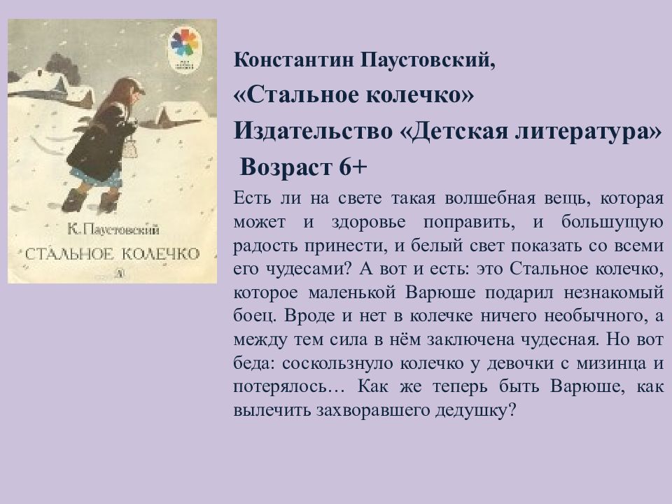 Константин Паустовский, «Стальное колечко» Издательство «Детская литература» Возраст 6+ Есть ли на свете такая волшебная вещь, которая может и здоровье поправить, и большущую радость принести, и белый свет показать со всеми его чудесами? А вот и есть: это Стальное колечко, которое маленькой Варюше подарил незнакомый боец. Вроде и нет в колечке ничего необычного, а между тем сила в нём заключена чудесная. Но вот беда: соскользнуло колечко у девочки с мизинца и потерялось… Как же теперь быть Варюше, как вылечить захворавшего дедушку?