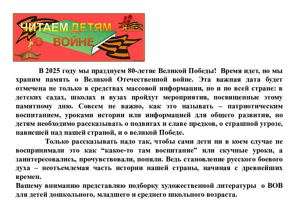 В 2025 году мы празднуем 80-летие Великой Победы! Время идет, но мы храним память о Великой Отечественной войне. Эта важная дата будет отмечена не только в средствах массовой информации, но и по всей стране: в детских садах, школах и вузах пройдут мероприятия, посвященные этому памятному дню. Совсем не важно, как это называть – патриотическим воспитанием, уроками истории или информацией для общего развития, но детям необходимо рассказывать о подвигах и славе предков, о страшной угрозе, нависшей над нашей страной, и о великой Победе. Только рассказывать надо так, чтобы сами дети ни в коем случае не воспринимали это как “какое-то там воспитание” или скучные уроки, а заинтересовались, прочувствовали, поняли. Ведь становление русского боевого духа – неотъемлемая часть истории нашей страны, начиная с древнейших времен. Вашему вниманию представляю подборку художественной литературы о ВОВ для детей дошкольного, младшего и среднего школьного возраста.