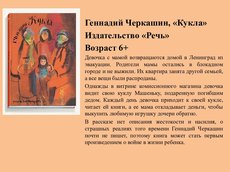 Геннадий Черкашин, «Кукла» Издательство «Речь» Возраст 6+ Девочка с мамой возвращаются домой в Ленинград из эвакуации. Родители мамы остались в блокадном городе и не выжили. Их квартира занята другой семьей, а все вещи были распроданы. Однажды в витрине комиссионного магазина девочка видит свою куклу Машеньку, подаренную погибшим дедом. Каждый день девочка приходит к своей кукле, читает ей книги, а ее мама откладывает деньги, чтобы выкупить любимую игрушку дочери обратно. В рассказе нет описания жестокости и насилия, о страшных реалиях того времени Геннадий Черкашин почти не пишет, поэтому книга может стать первым произведением о войне в жизни ребенка.
