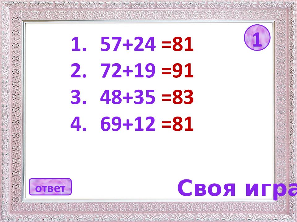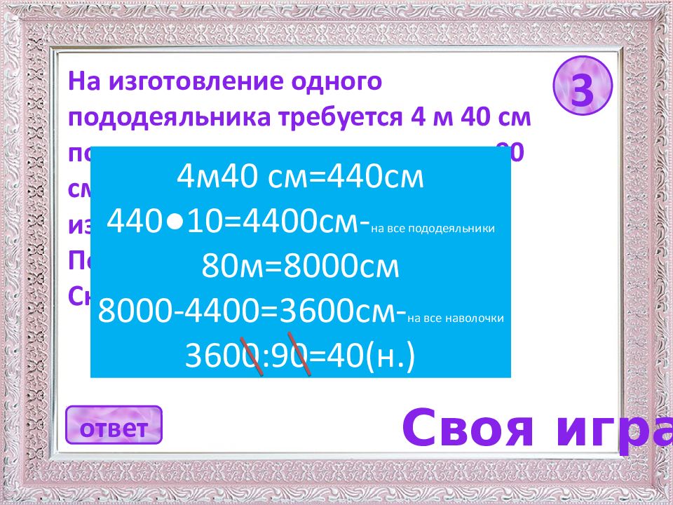 3 Своя игра ответ На изготовление одного пододеяльника требуется 4 м 40 см полотна, а на одну наволочку — 90 см полотна. Всего было израсходовано 80 м полотна. Пододеяльников сшили 10 штук. Сколько сшили наволочек? 4м40 см=440см 440●10=4400см- на все пододеяльники 80м=8000см 8000-4400=3600см- на все наволочки 3600:90=40(н.)