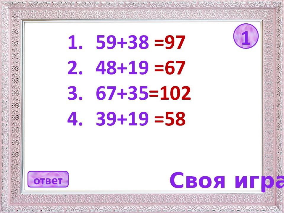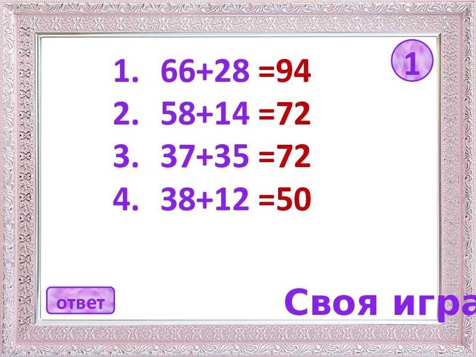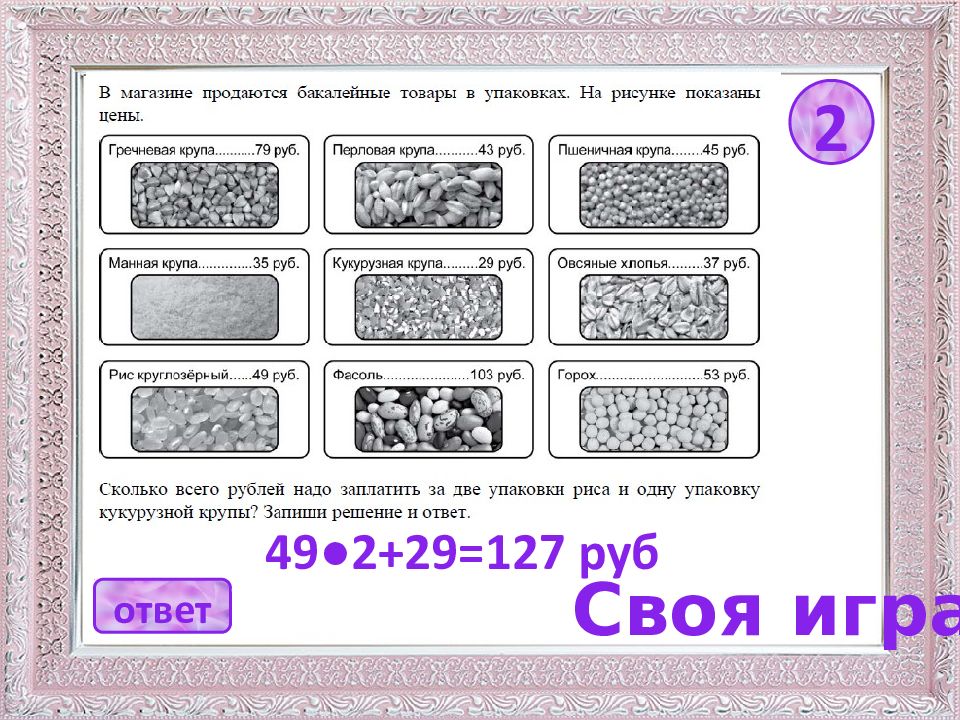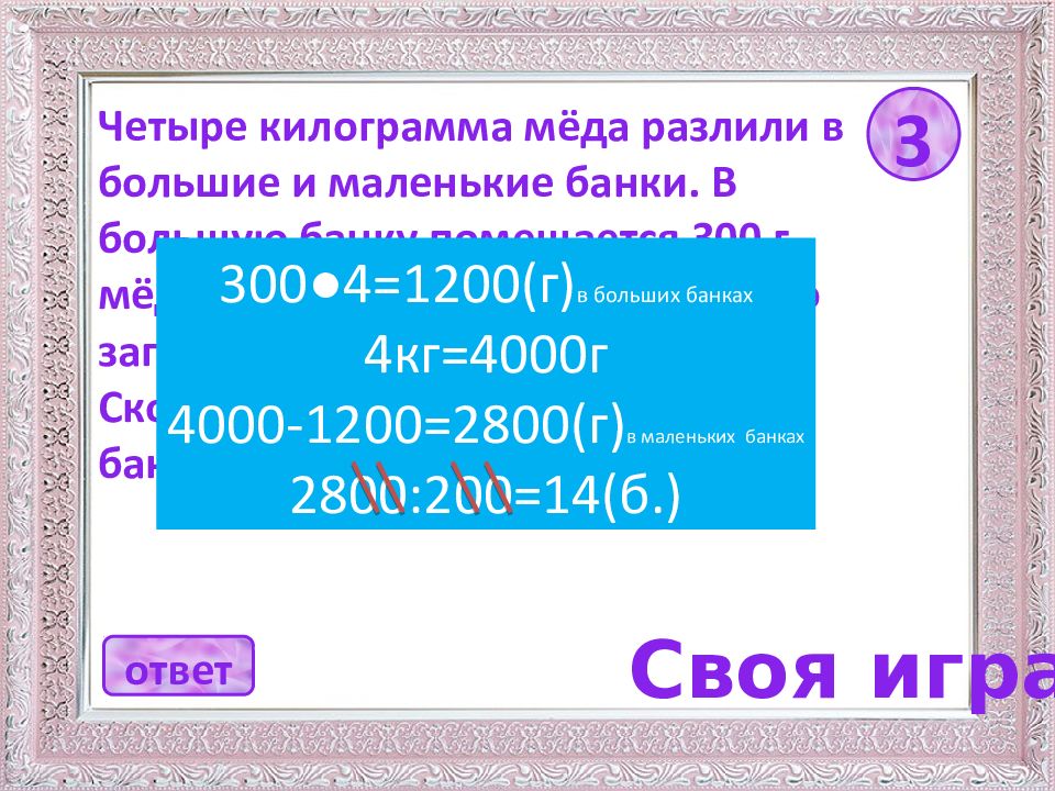 3 Своя игра ответ Четыре килограмма мёда разлили в большие и маленькие банки. В большую банку помещается 300 г мёда, а в маленькую — 200 г. Было заполнено 4 большие банки. Сколько потребовалось маленьких банок? 300●4=1200(г) в больших банках 4кг=4000г 4000-1200=2800(г) в маленьких банках 2800:200=14(б.)