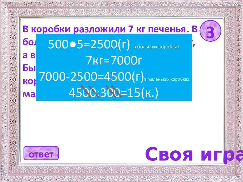 3 Своя игра ответ В коробки разложили 7 кг печенья. В большую коробку помещается 500 г, а в маленькую — 300 г печенья. Было использовано 5 больших коробок. Сколько потребовалось маленьких коробок? 500●5=2500(г) в больших коробках 7кг=7000г 7000-2500=4500(г) в маленьких коробках 4500:300=15(к.)