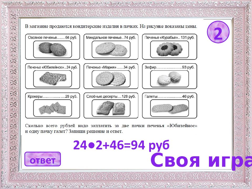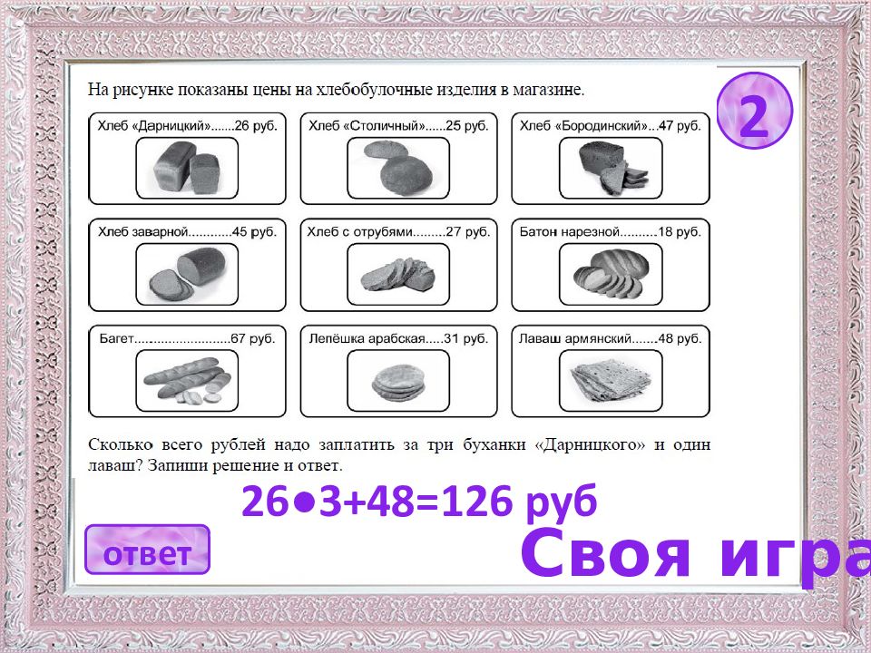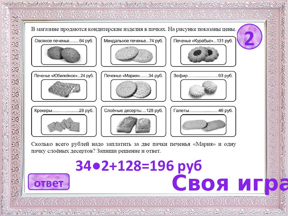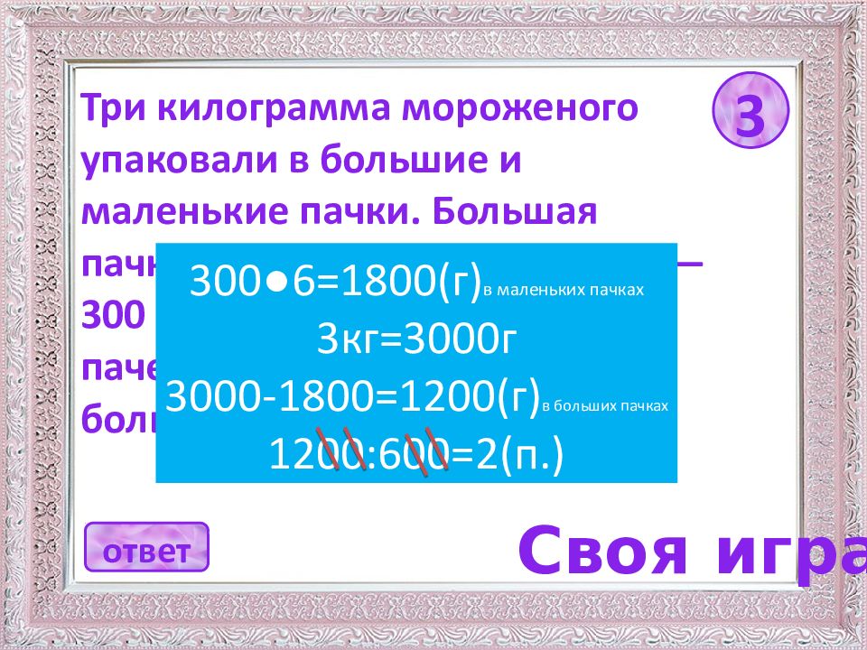 3 Своя игра ответ Три килограмма мороженого упаковали в большие и маленькие пачки. Большая пачка весит 600 г, а маленькая — 300 г. Получилось 6 маленьких пачек. Сколько понадобилось больших пачек? 300●6=1800(г) в маленьких пачках 3кг=3000г 3000-1800=1200(г) в больших пачках 1200:600=2(п.)