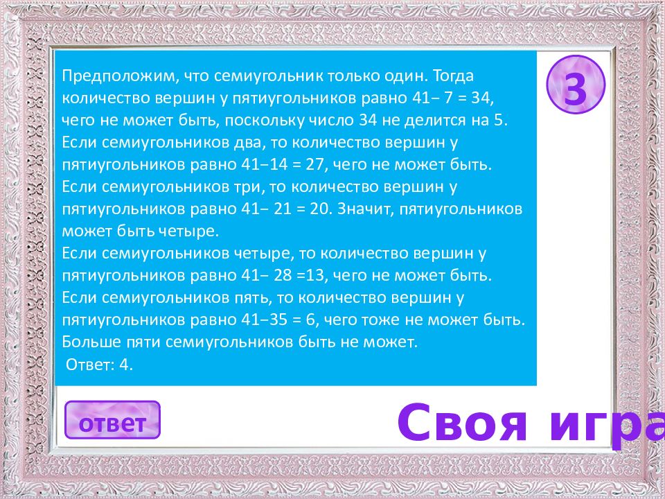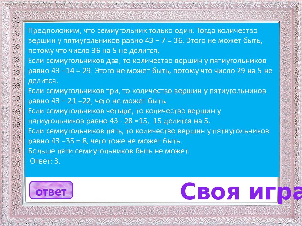 3 Своя игра ответ Рита вырезала из бумаги несколько пятиугольников и семиугольников. Всего у вырезанных фигурок 43 вершины. Сколько пятиугольников вырезала Рита? Предположим, что семиугольник только один. Тогда количество вершин у пятиугольников равно 43 − 7 = 36. Этого не может быть, потому что число 36 на 5 не делится. Если семиугольников два, то количество вершин у пятиугольников равно 43 −14 = 29. Этого не может быть, потому что число 29 на 5 не делится. Если семиугольников три, то количество вершин у пятиугольников равно 43 − 21 =22, чего не может быть. Если семиугольников четыре, то количество вершин у пятиугольников равно 43− 28 =15, 15 делится на 5. Если семиугольников пять, то количество вершин у пятиугольников равно 43 −35 = 8, чего тоже не может быть. Больше пяти семиугольников быть не может. Ответ: 3.