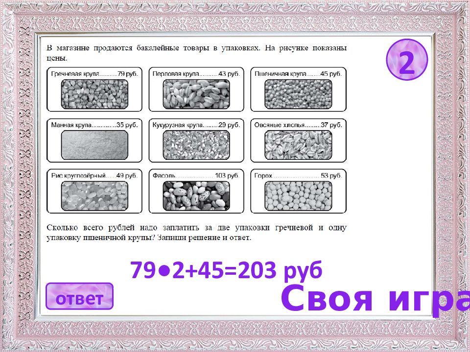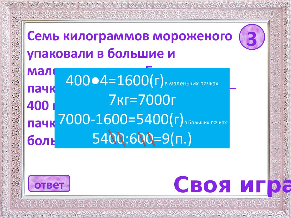 3 Своя игра ответ Семь килограммов мороженого упаковали в большие и маленькие пачки. Большая пачка весит 600 г, а маленькая — 400 г. Получилось 4 маленьких пачки. Сколько понадобилось больших пачек? 400●4=1600(г) в маленьких пачках 7кг=7000г 7000-1600=5400(г) в больших пачках 5400:600=9(п.)