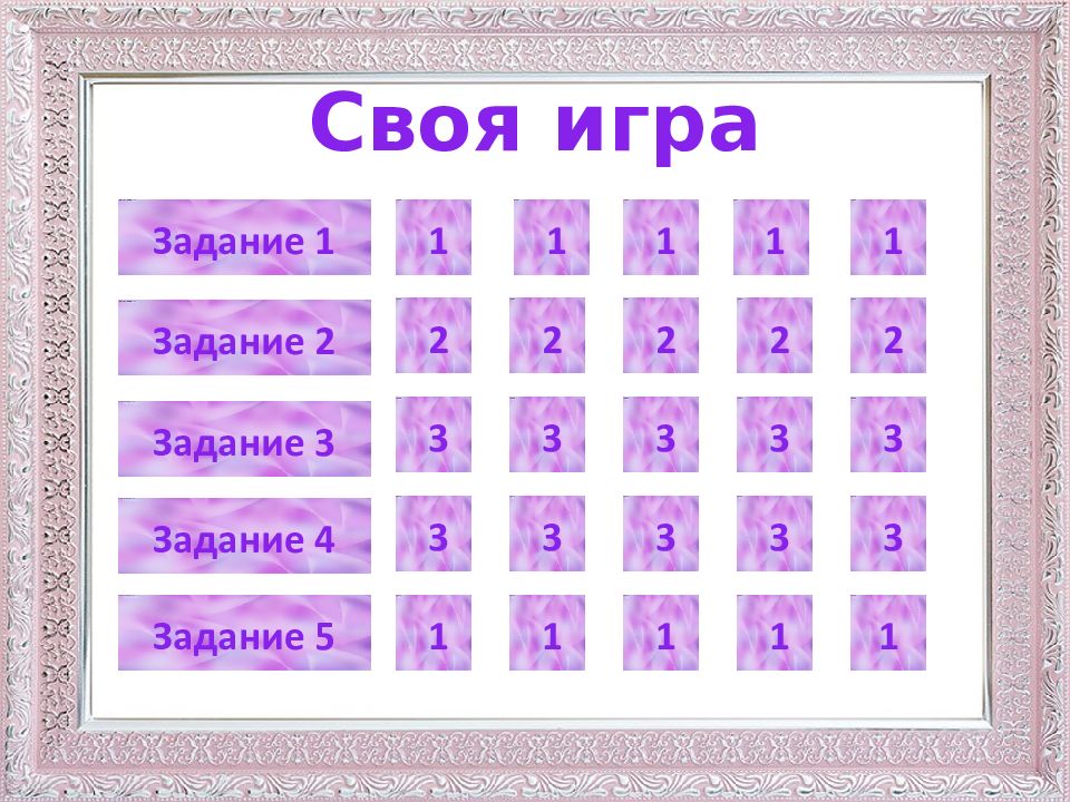 Задание 1 Своя игра Задание 2 Задание 3 Задание 4 Задание 5 1 1 1 1 1 2 2 2 2 2 3 3 3 3 3 3 3 3 3 3 1 1 1 1 1