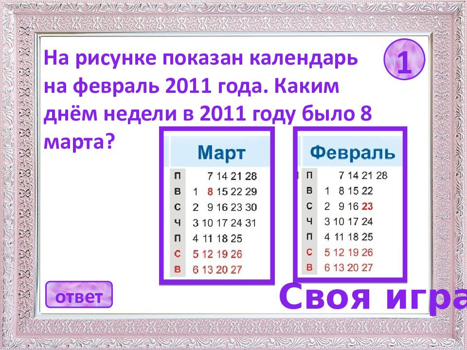 1 Своя игра ответ На рисунке показан календарь на февраль 2011 года. Каким днём недели в 2011 году было 8 марта?