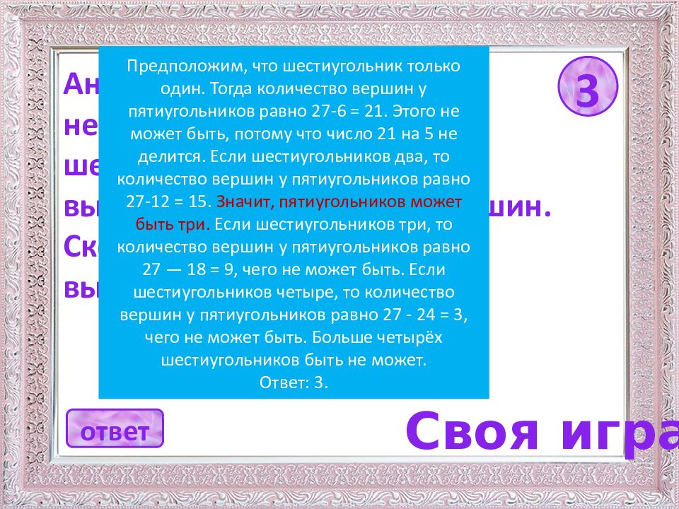 3 Своя игра ответ Андрей вырезал из бумаги несколько пятиугольников и шестиугольников. Всего у вырезанных фигурок 27 вершин. Сколько пятиугольников вырезал Андрей? Предположим, что шестиугольник только один. Тогда количество вершин у пятиугольников равно 27-6 = 21. Этого не может быть, потому что число 21 на 5 не делится. Если шестиугольников два, то количество вершин у пятиугольников равно 27-12 = 15. Значит, пятиугольников может быть три. Если шестиугольников три, то количество вершин у пятиугольников равно 27 — 18 = 9, чего не может быть. Если шестиугольников четыре, то количество вершин у пятиугольников равно 27 - 24 = 3, чего не может быть. Больше четырёх шестиугольников быть не может. Ответ: 3.