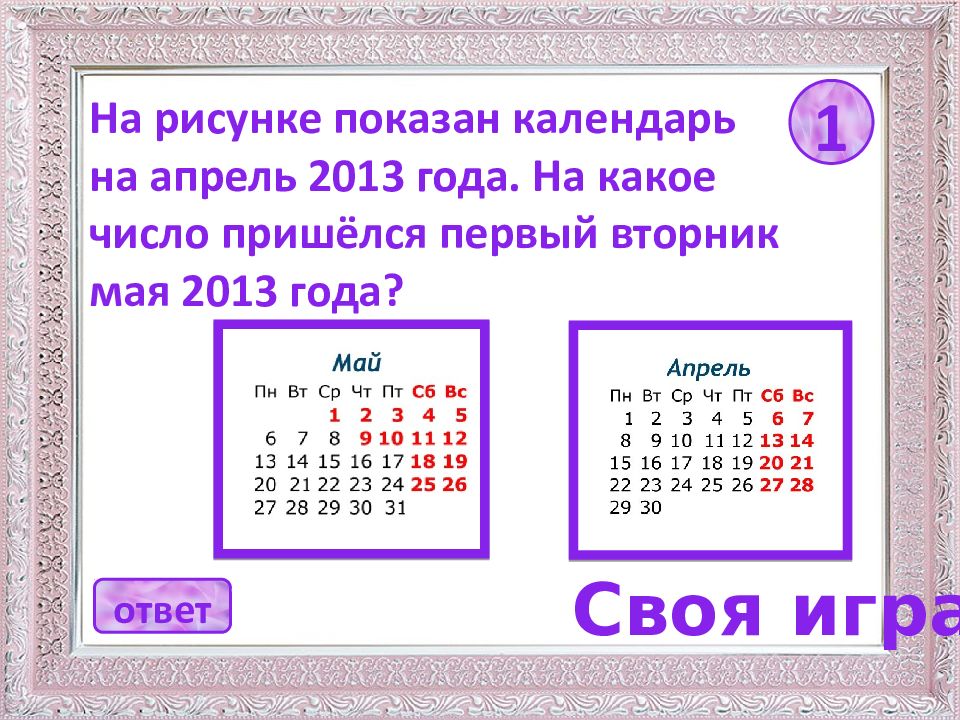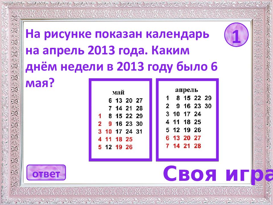1 Своя игра ответ На рисунке показан календарь на апрель 2013 года. Каким днём недели в 2013 году было 6 мая?