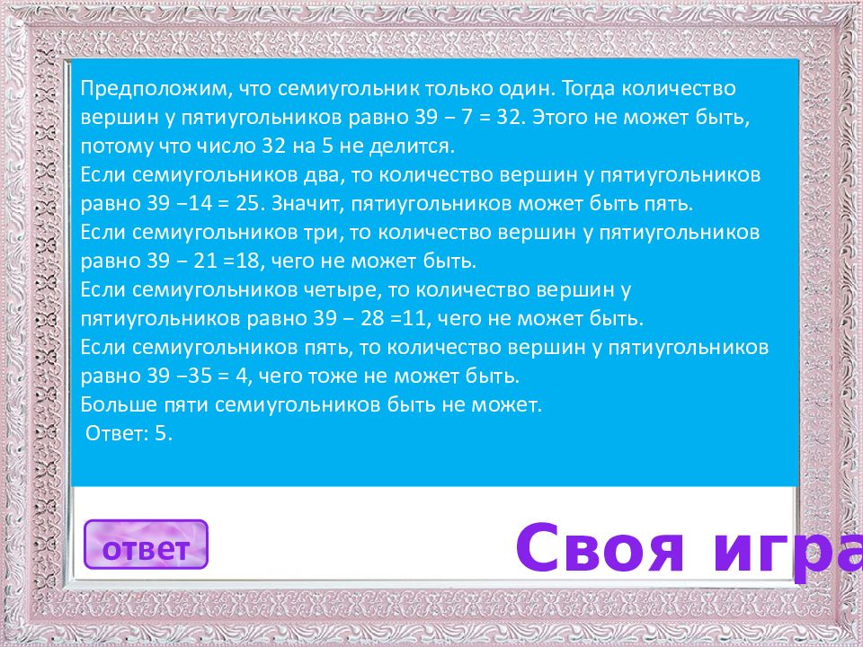 3 Своя игра ответ Лена вырезала из бумаги несколько пятиугольников и семиугольников. Всего у вырезанных фигурок 39 вершин. Сколько пятиугольников вырезала Лена? Предположим, что семиугольник только один. Тогда количество вершин у пятиугольников равно 39 − 7 = 32. Этого не может быть, потому что число 32 на 5 не делится. Если семиугольников два, то количество вершин у пятиугольников равно 39 −14 = 25. Значит, пятиугольников может быть пять. Если семиугольников три, то количество вершин у пятиугольников равно 39 − 21 =18, чего не может быть. Если семиугольников четыре, то количество вершин у пятиугольников равно 39 − 28 =11, чего не может быть. Если семиугольников пять, то количество вершин у пятиугольников равно 39 −35 = 4, чего тоже не может быть. Больше пяти семиугольников быть не может. Ответ: 5.