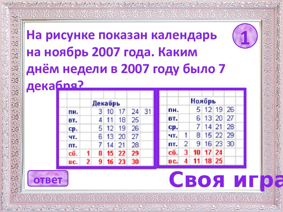 1 Своя игра ответ На рисунке показан календарь на ноябрь 2007 года. Каким днём недели в 2007 году было 7 декабря?