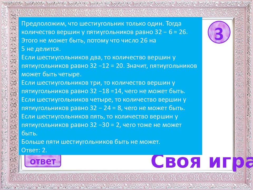 3 Своя игра ответ Паша вырезал из бумаги несколько пятиугольников и шестиугольников. Всего у вырезанных фигурок 32 вершины. Сколько шестиугольников вырезал Паша? Предположим, что шестиугольник только один. Тогда количество вершин у пятиугольников равно 32 − 6 = 26. Этого не может быть, потому что число 26 на 5 не делится. Если шестиугольников два, то количество вершин у пятиугольников равно 32 −12 = 20. Значит, пятиугольников может быть четыре. Если шестиугольников три, то количество вершин у пятиугольников равно 32 −18 =14, чего не может быть. Если шестиугольников четыре, то количество вершин у пятиугольников равно 32 − 24 = 8, чего не может быть. Если шестиугольников пять, то количество вершин у пятиугольников равно 32 −30 = 2, чего тоже не может быть. Больше пяти шестиугольников быть не может. Ответ: 2.