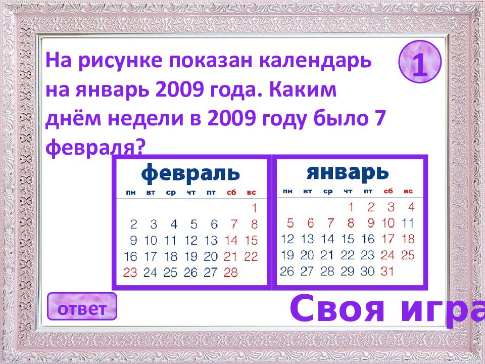1 Своя игра ответ На рисунке показан календарь на январь 2009 года. Каким днём недели в 2009 году было 7 февраля?