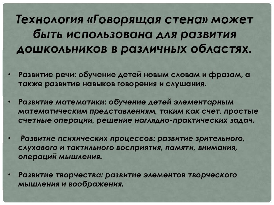 Технология «Говорящая стена» может быть использована для развития дошкольников в различных областях. Развитие речи: обучение детей новым словам и фразам, а также развитие навыков говорения и слушания. Развитие математики: обучение детей элементарным математическим представлениям, таким как счет, простые счетные операции, решение наглядно-практических задач. Развитие психических процессов: развитие зрительного, слухового и тактильного восприятия, памяти, внимания, операций мышления. Развитие творчества: развитие элементов творческого мышления и воображения.