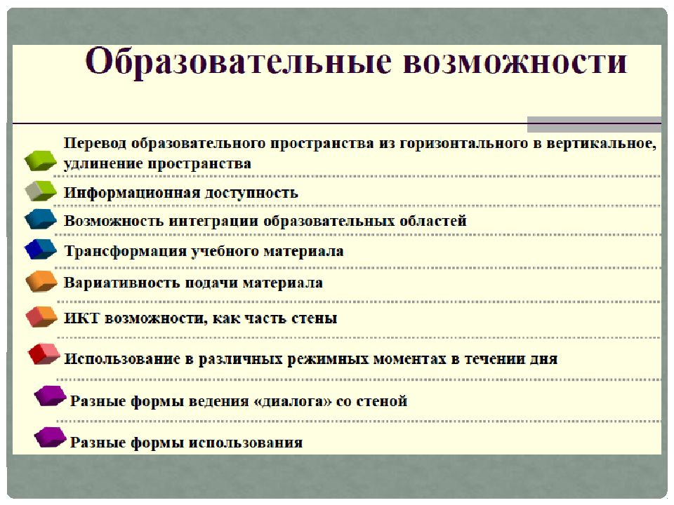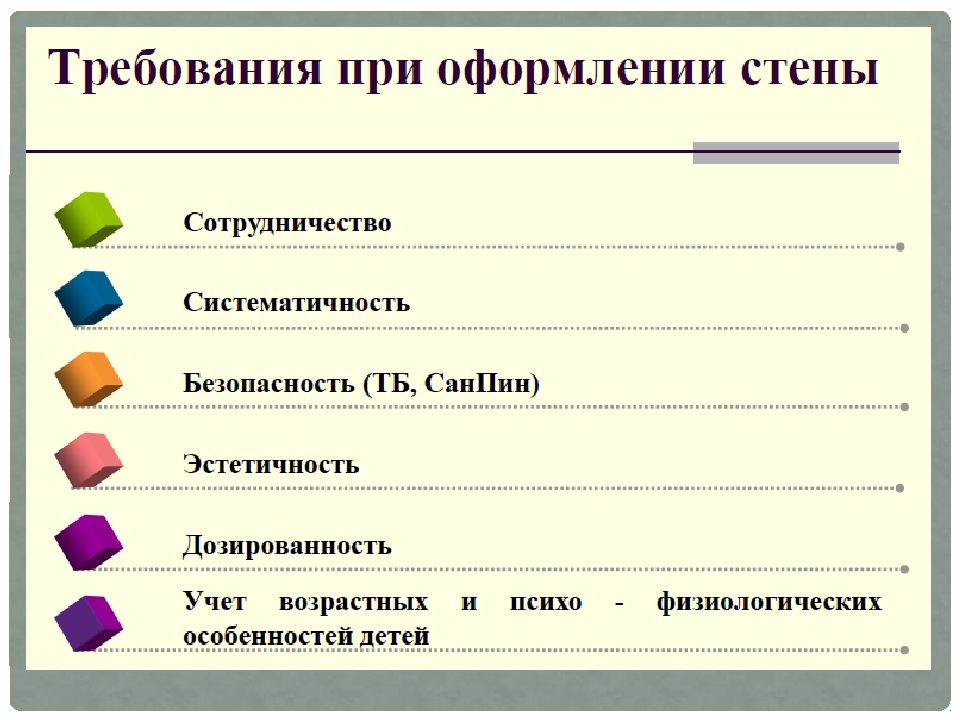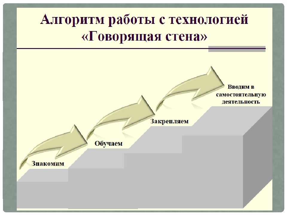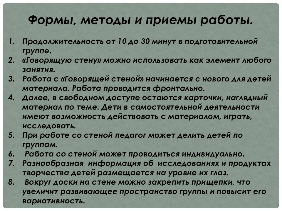 Формы, методы и приемы работы. Продолжительность от 10 до 30 минут в подготовительной группе. «Говорящую стену» можно использовать как элемент любого занятия. Работа с «Говорящей стеной» начинается с нового для детей материала. Работа проводится фронтально. Далее, в свободном доступе остаются карточки, наглядный материал по теме. Дети в самостоятельной деятельности имеют возможность действовать с материалом, играть, исследовать. При работе со стеной педагог может делить детей по группам. Работа со стеной может проводиться индивидуально. Разнообразная и нформация об исследованиях и продуктах творчества детей размещается на уровне их глаз. Вокруг доски на стене можно закрепить прищепки, что увеличит развивающее пространство группы и повысит его вариативность.