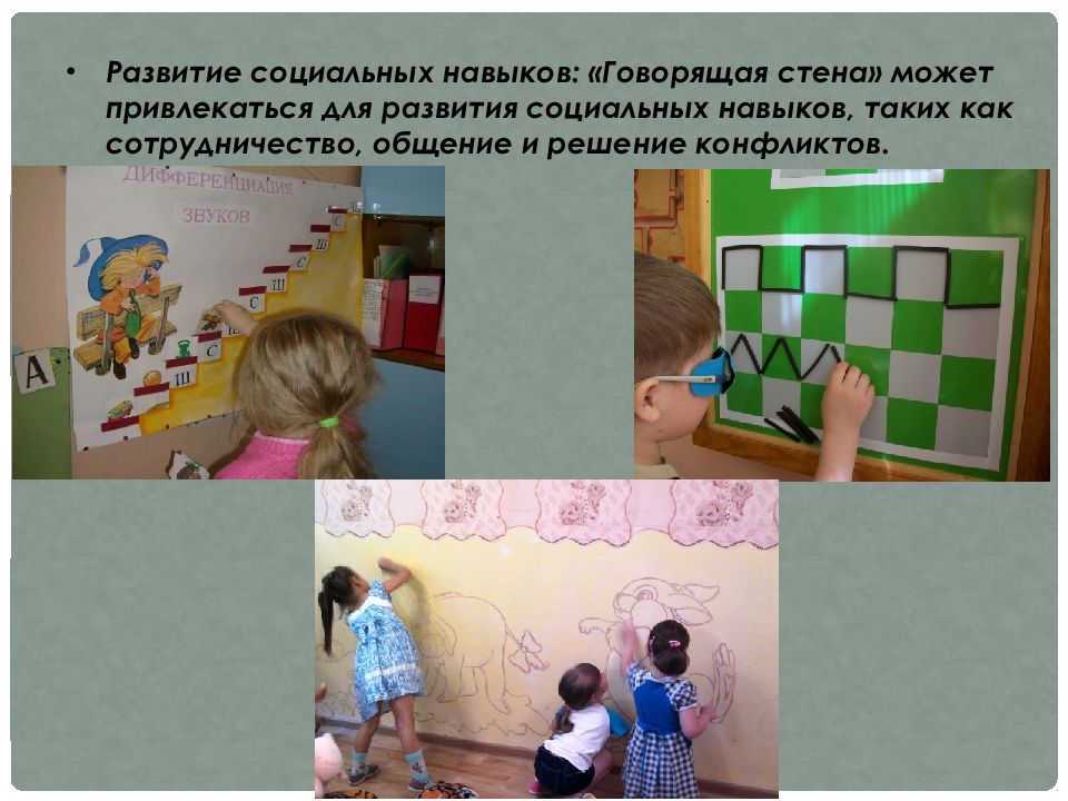 Развитие социальных навыков: «Говорящая стена» может привлекаться для развития социальных навыков, таких как сотрудничество, общение и решение конфликтов.