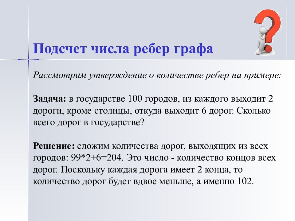 Рассмотрим утверждение о количестве ребер на примере: Задача: в государстве 100 городов, из каждого выходит 2 дороги, кроме столицы, откуда выходит 6 дорог. Сколько всего дорог в государстве? Решение: сложим количества дорог, выходящих из всех городов: 99*2+6=204. Это число - количество концов всех дорог. Поскольку каждая дорога имеет 2 конца, то количество дорог будет вдвое меньше, а именно 102. Подсчет числа ребер графа