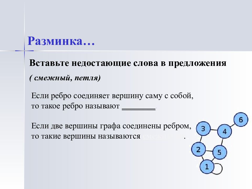 Если ребро соединяет вершину саму с собой, то такое ребро называют ________. Если две вершины графа соединены ребром, то такие вершины называются смежными. Разминка… Вставьте недостающие слова в предложения ( смежный, петля)