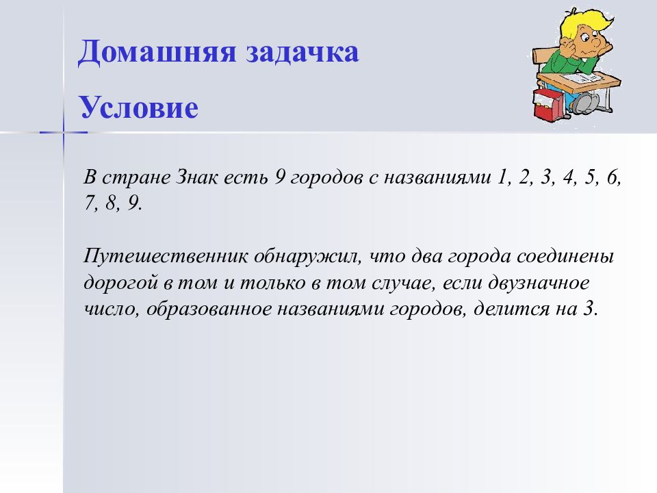 Слайд 5: В стране Знак есть 9 городов с названиями 1, 2, 3, 4, 5, 6, 7, 8, 9. Путешественник обнаружил, что два города соединены дорогой в том и только в том случае, если двузначное число, образованное названиями городов, делится на 3