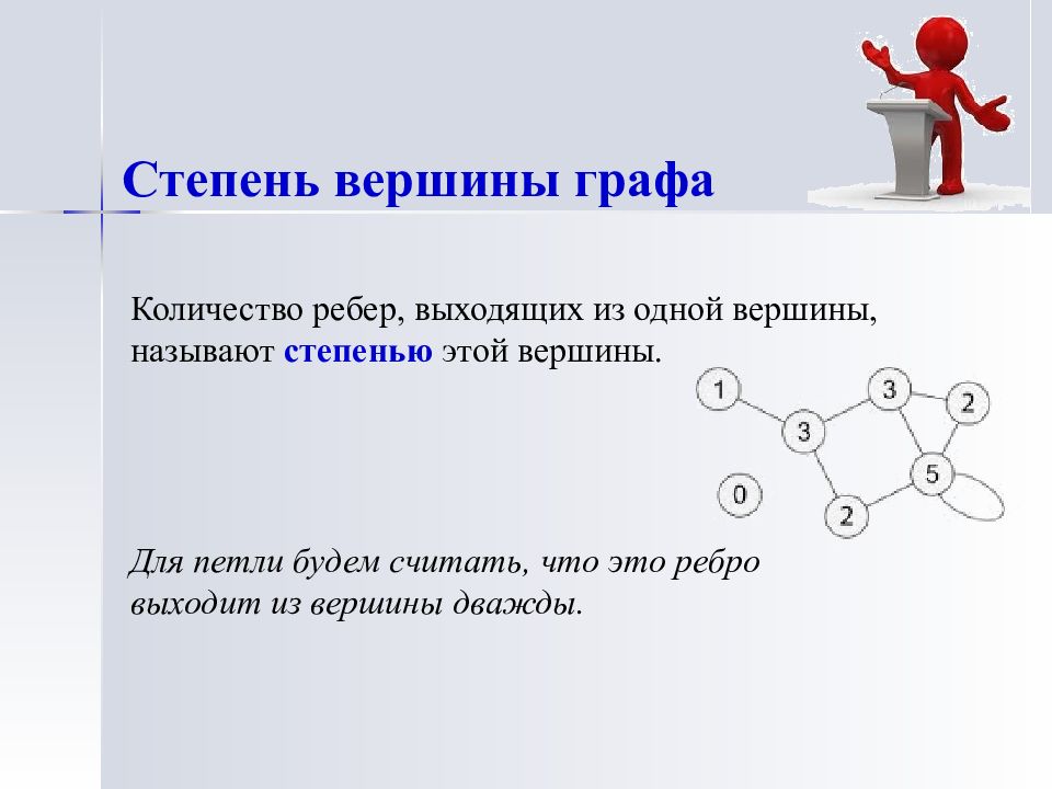 Количество ребер, выходящих из одной вершины, называют степенью этой вершины. Для петли будем считать, что это ребро выходит из вершины дважды. Степень вершины графа