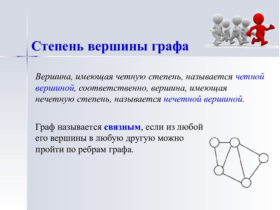 Граф называется связным, если из любой его вершины в любую другую можно пройти по ребрам графа. Степень вершины графа