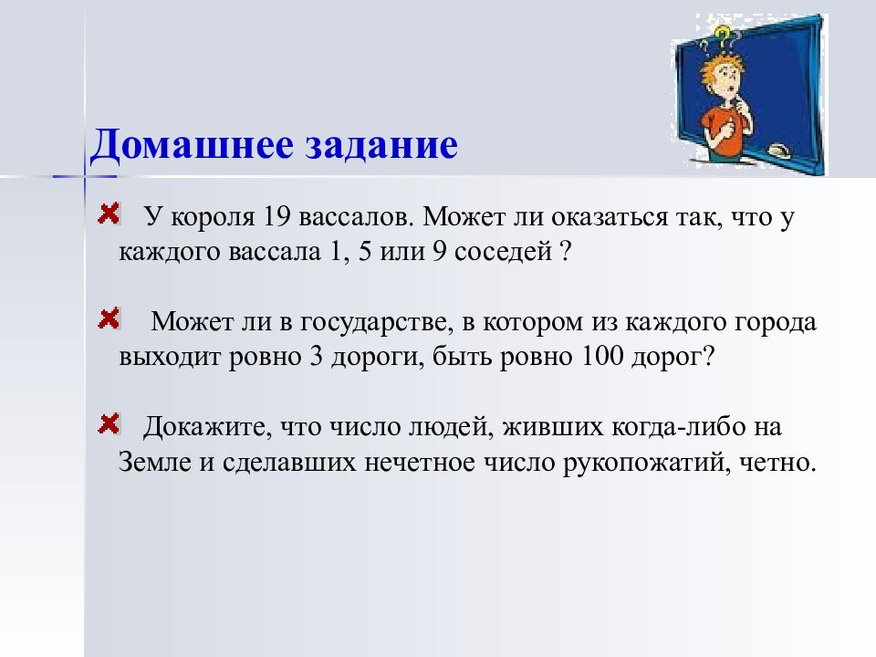 Домашнее задание У короля 19 вассалов. Может ли оказаться так, что у каждого вассала 1, 5 или 9 соседей ? Может ли в государстве, в котором из каждого города выходит ровно 3 дороги, быть ровно 100 дорог? Докажите, что число людей, живших когда-либо на Земле и сделавших нечетное число рукопожатий, четно.