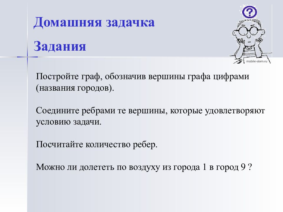 Постройте граф, обозначив вершины графа цифрами (названия городов). Соедините ребрами те вершины, которые удовлетворяют условию задачи. Посчитайте количество ребер. Можно ли долететь по воздуху из города 1 в город 9 ? Домашняя задачка Задания