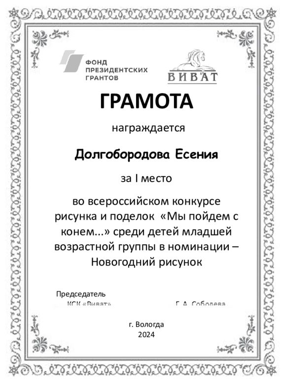 ГРАМОТА награждается Долгобородова Есения за I место во всероссийском конкурсе рисунка и поделок «Мы пойдем с конем...» среди детей младшей возрастной группы в номинации – Новогодний рисунок Председатель КСК «Виват» Г. А. Соболева г. Вологда 2024