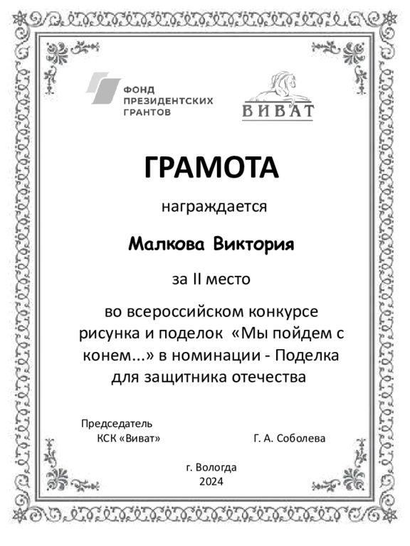 ГРАМОТА награждается Малкова Виктория за II место во всероссийском конкурсе рисунка и поделок «Мы пойдем с конем...» в номинации - Поделка для защитника отечества Председатель КСК «Виват» Г. А. Соболева г. Вологда 2024