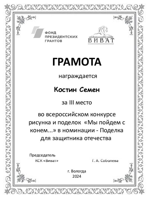 ГРАМОТА награждается Костин Семен за III место во всероссийском конкурсе рисунка и поделок «Мы пойдем с конем...» в номинации - Поделка для защитника отечества Председатель КСК «Виват» Г. А. Соболева г. Вологда 2024