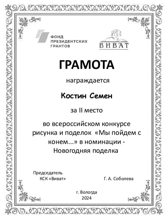 ГРАМОТА награждается Костин Семен за II место во всероссийском конкурсе рисунка и поделок «Мы пойдем с конем...» в номинации - Новогодняя поделка Председатель КСК «Виват» Г. А. Соболева г. Вологда 2024