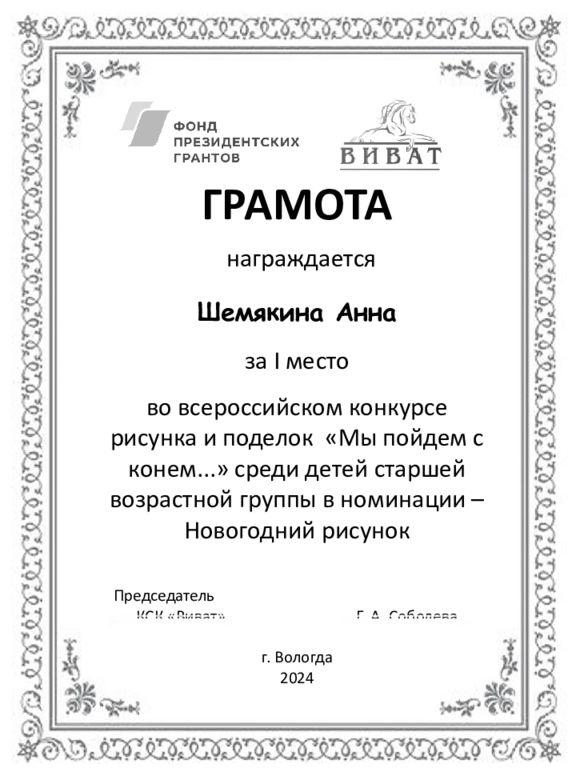 ГРАМОТА награждается Шемякина Анна за I место во всероссийском конкурсе рисунка и поделок «Мы пойдем с конем...» среди детей старшей возрастной группы в номинации – Новогодний рисунок Председатель КСК «Виват» Г. А. Соболева г. Вологда 2024