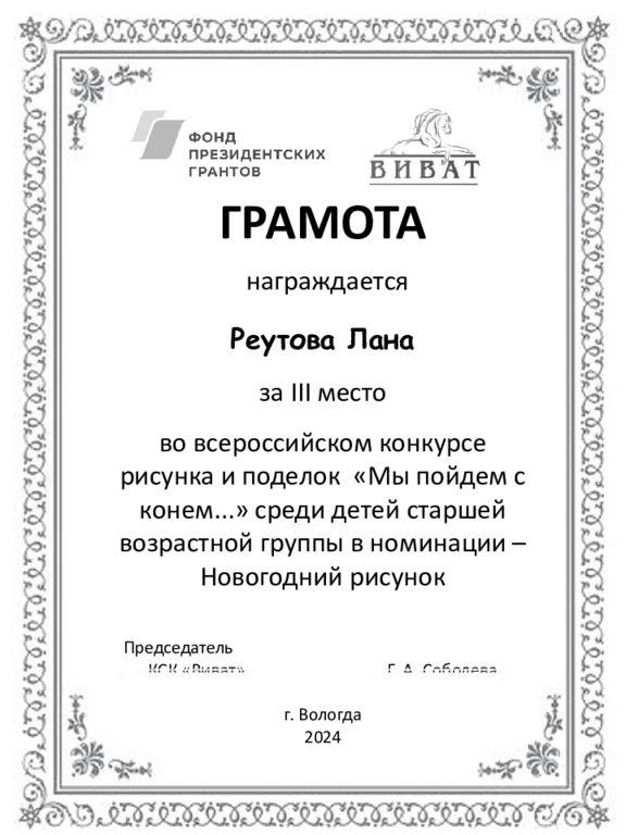 ГРАМОТА награждается Реутова Лана за III место во всероссийском конкурсе рисунка и поделок «Мы пойдем с конем...» среди детей старшей возрастной группы в номинации – Новогодний рисунок Председатель КСК «Виват» Г. А. Соболева г. Вологда 2024